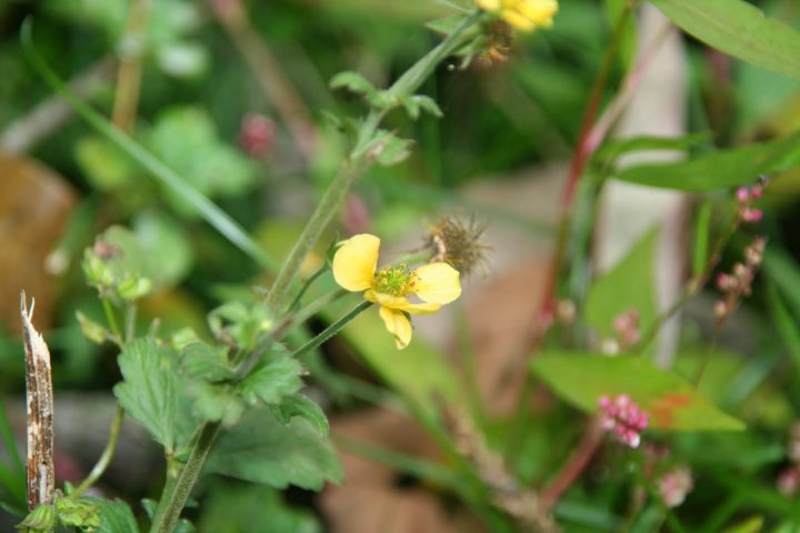 バラ科の多年草。葉の形状が大 根に似ている。黄色で5弁の花をつける。花後に鍵状の花柱が集まる集合果をつける。