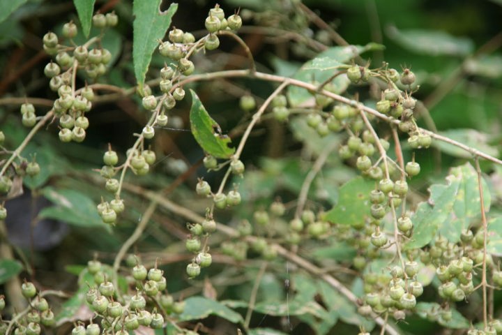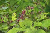 夏、葉の付け根に淡紫色の小花を開き、秋に球形の紫色の美しい液果を付ける。