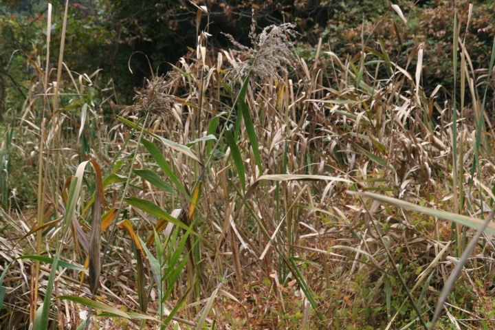 イネ科の多年草。秋、多数の細かい帯紫色の小花から成る 穂を出す。アシとも言う。