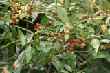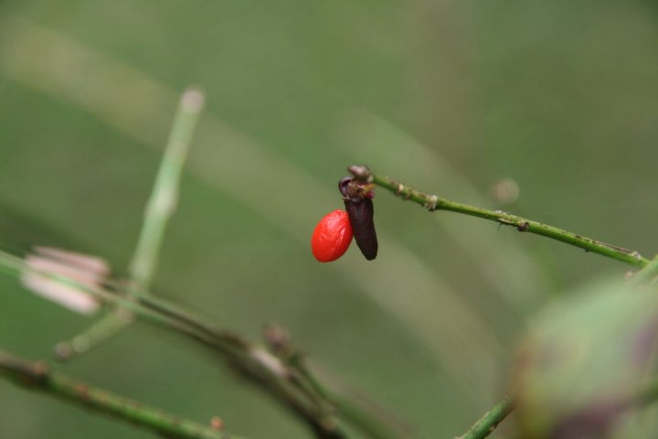 初夏黄緑色の小花をつけ、果実は晩秋熟し、裂けて橙紅色の種子となる。