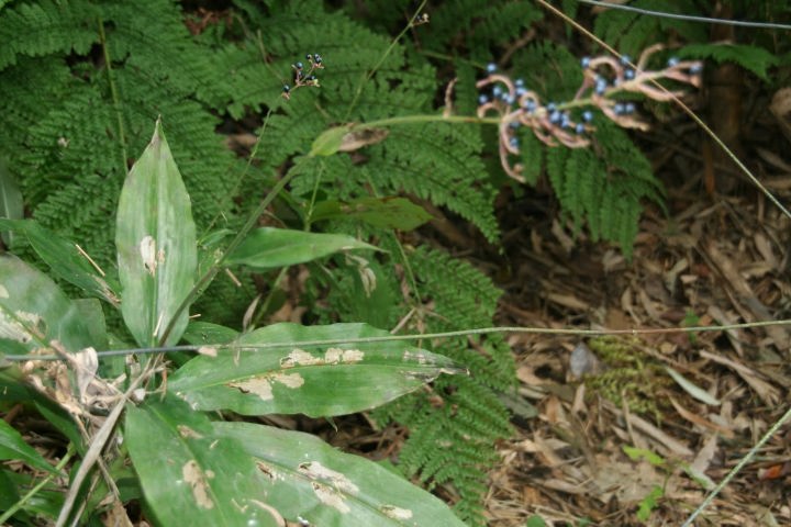 ツユクサ科の多年草。葉がミョウガに 似ている。夏、白色の小花を開き、のち球形・藍色の果実を結ぶ。