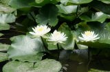 スイレン科の多年生水草。7〜8月頃、水面上に、ハスに似た白色の花を開く。