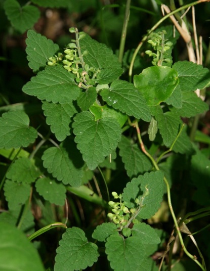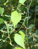 ブドウ科の落葉低木。巻きひげは二股に分かれ、葉は丸いハート形。淡黄緑色5弁の小花をつけ、後球状の液果を結ぶ。食べられない。ヘビブドウとも言う
