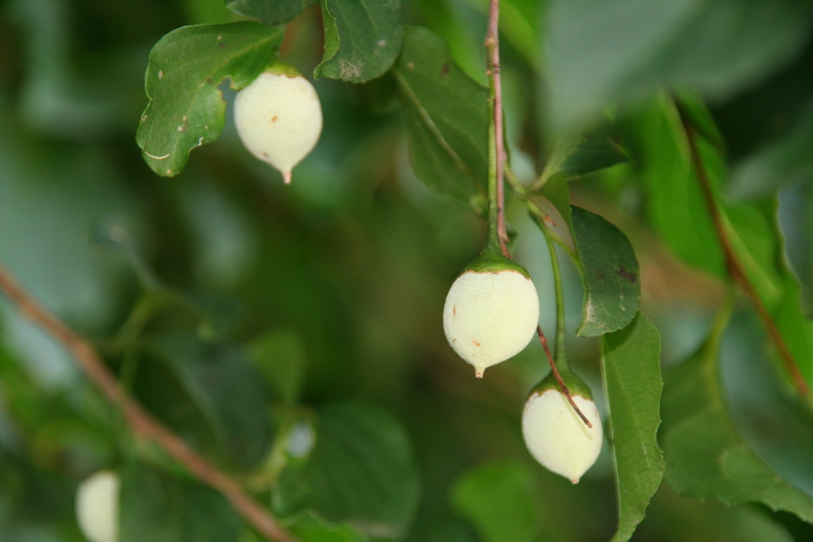 初夏、白色五弁花をつける。果実は球状で熟すと殻が裂けて褐色の種子を出す。
